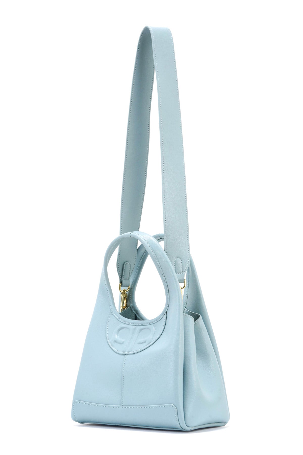 Made from cow leather, this bag boasts modern minimalism with its sculptural silhouette, seamless curved handle, and debossed monogram. The magnetic closure reveals a spacious interior with a zip pocket for essentials, while a detachable long strap allows for versatile styling.