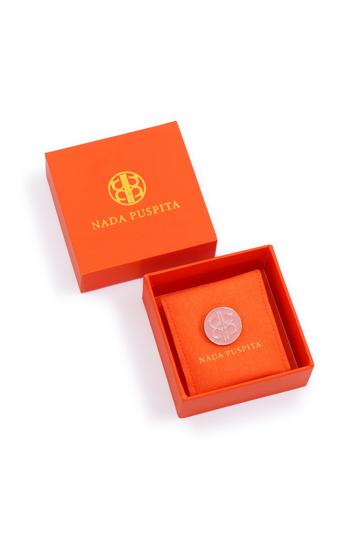 This petite brooch features the Nada Puspita monogram at its center, set on glossy enamel. Framed by a polished gold round edge, it adds a sweet, delicate charm like a macaron. Available in five colors.