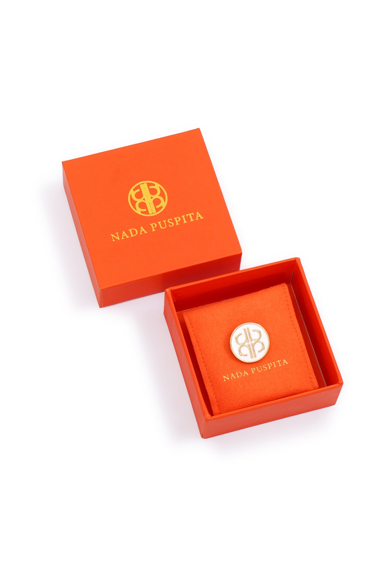 This petite brooch features the Nada Puspita monogram at its center, set on glossy enamel. Framed by a polished gold round edge, it adds a sweet, delicate charm like a macaron. Available in five colors.