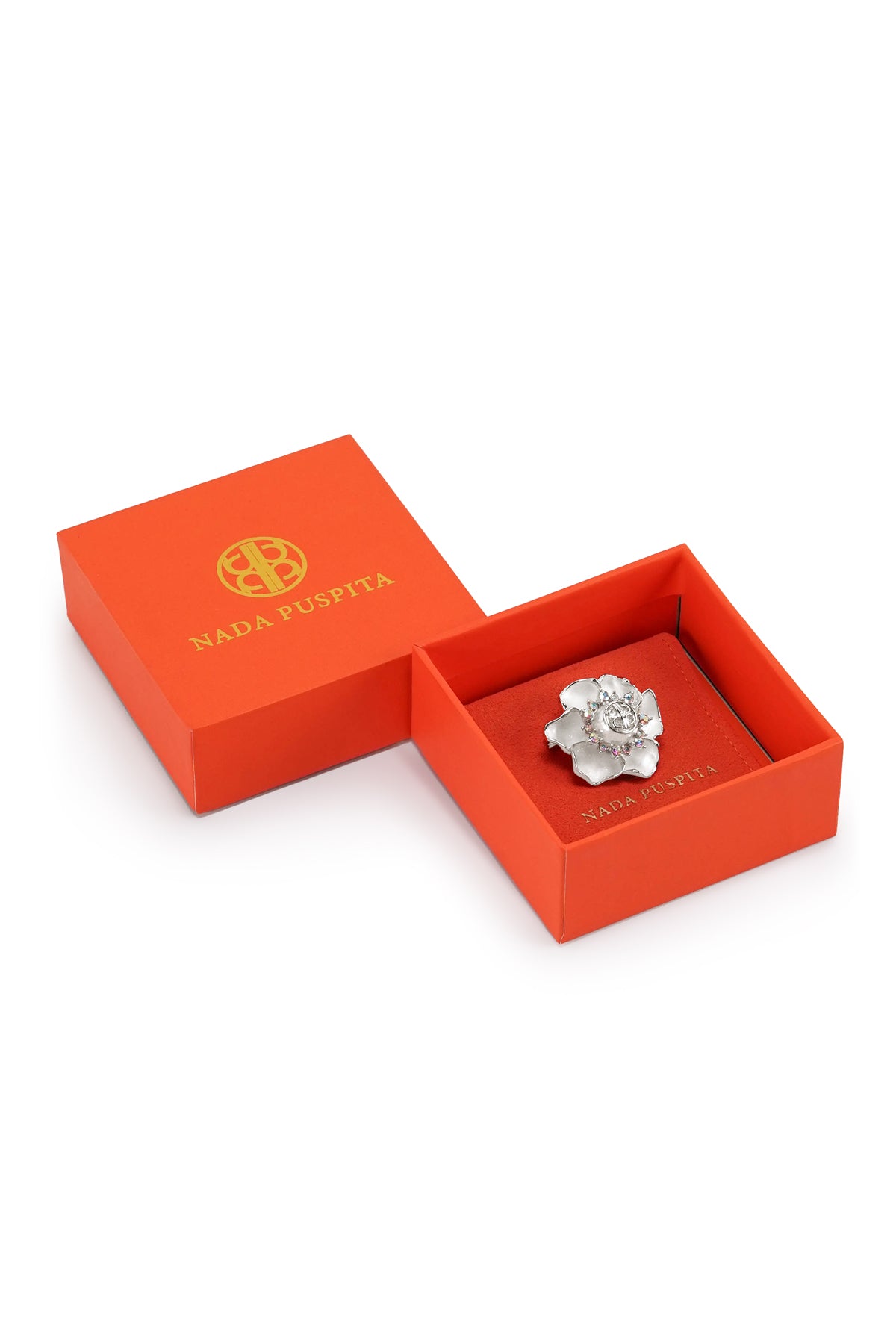 Inspired by the magnolia bloom, this pin brooch features enamel petals with the signature monogram at the center. Encircling the monogram is a circle of alternating crystals that creates a radiant effect. Available in five colors.
