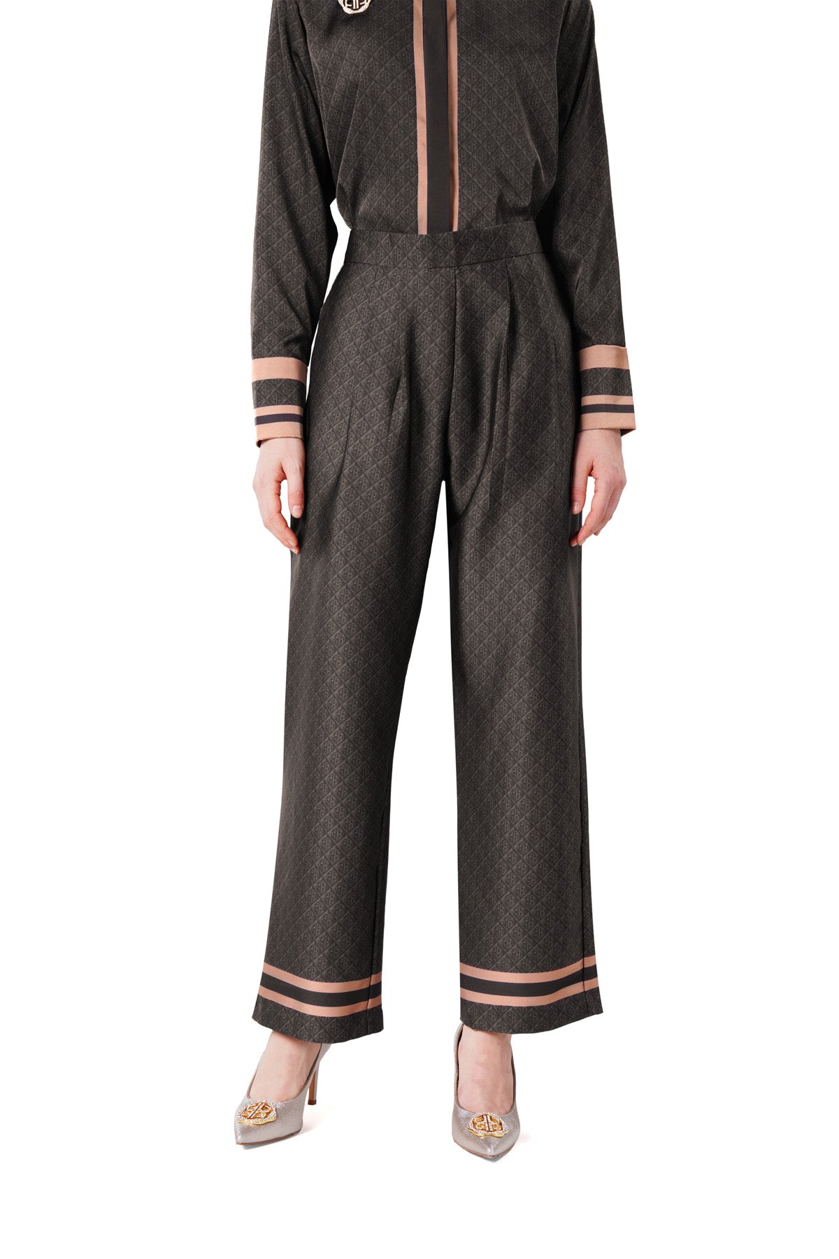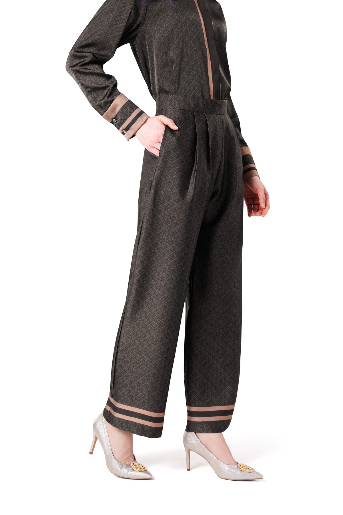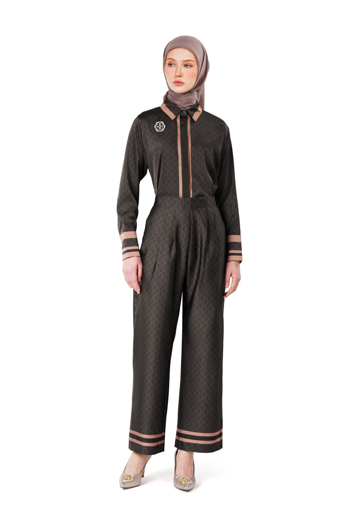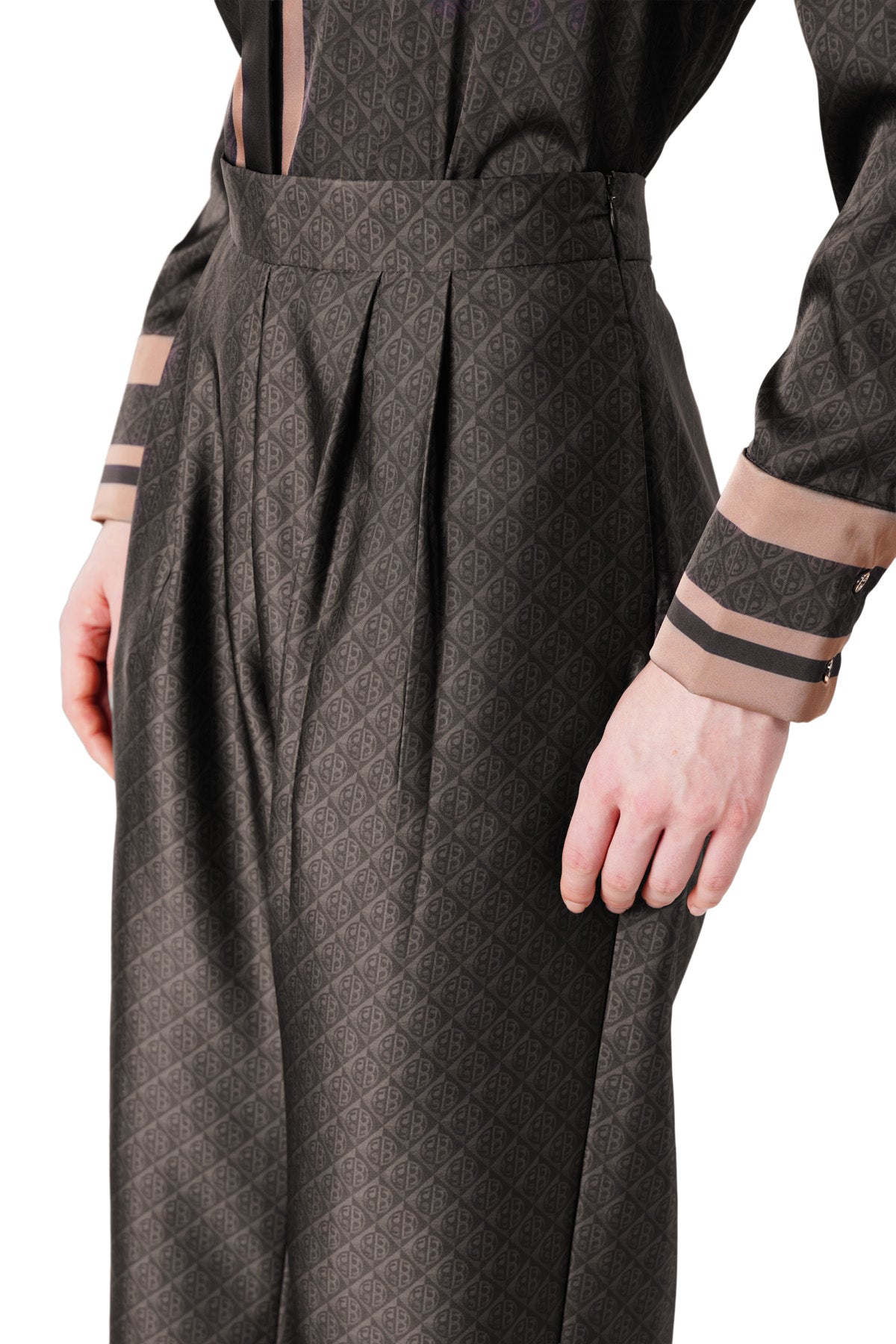 Exclusive from the runway of Jakarta Fashion Week 2026, these pants feature a geometric monogram pattern that elevates the tailored look. Designed in a wide-leg silhouette with a side waist zipper opening, side pockets, and contrast printed trim at the hem, flaunting a unique modern edge to any style.