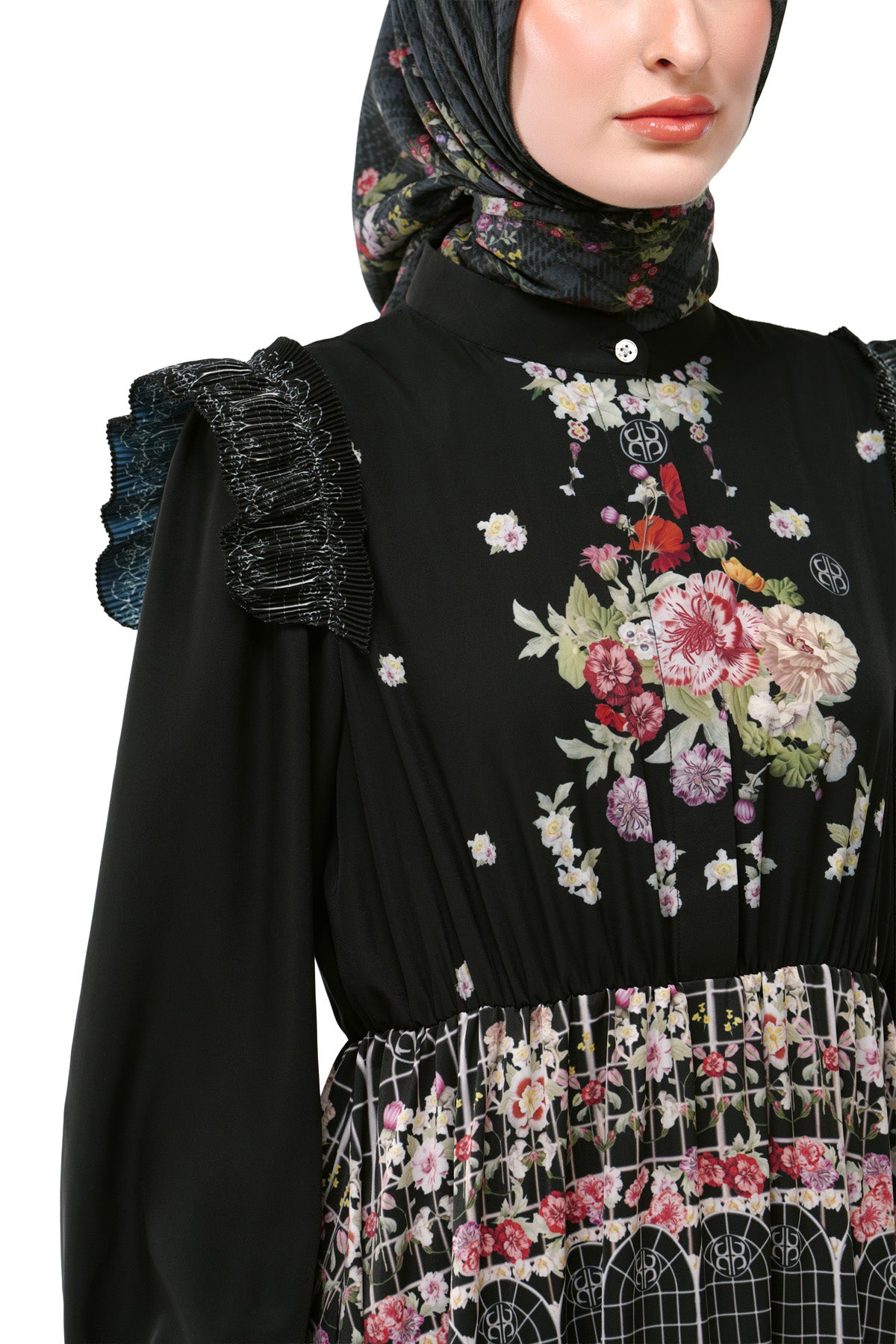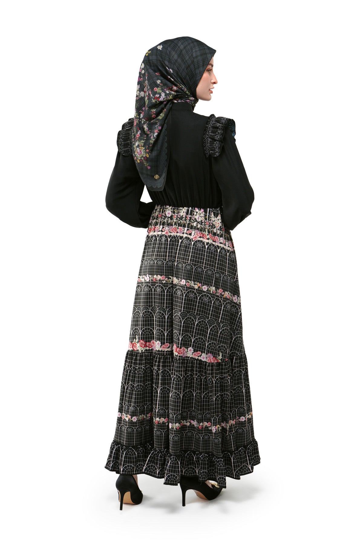 A graceful, long dress with vintage-inspired prints and floral patterns. Designed with a high mandarin collar, ruffled shoulders, and long puff sleeves for an elegant, modest silhouette. Finished with an elasticated waist and a tiered skirt that flows beautifully for a flattering fit.