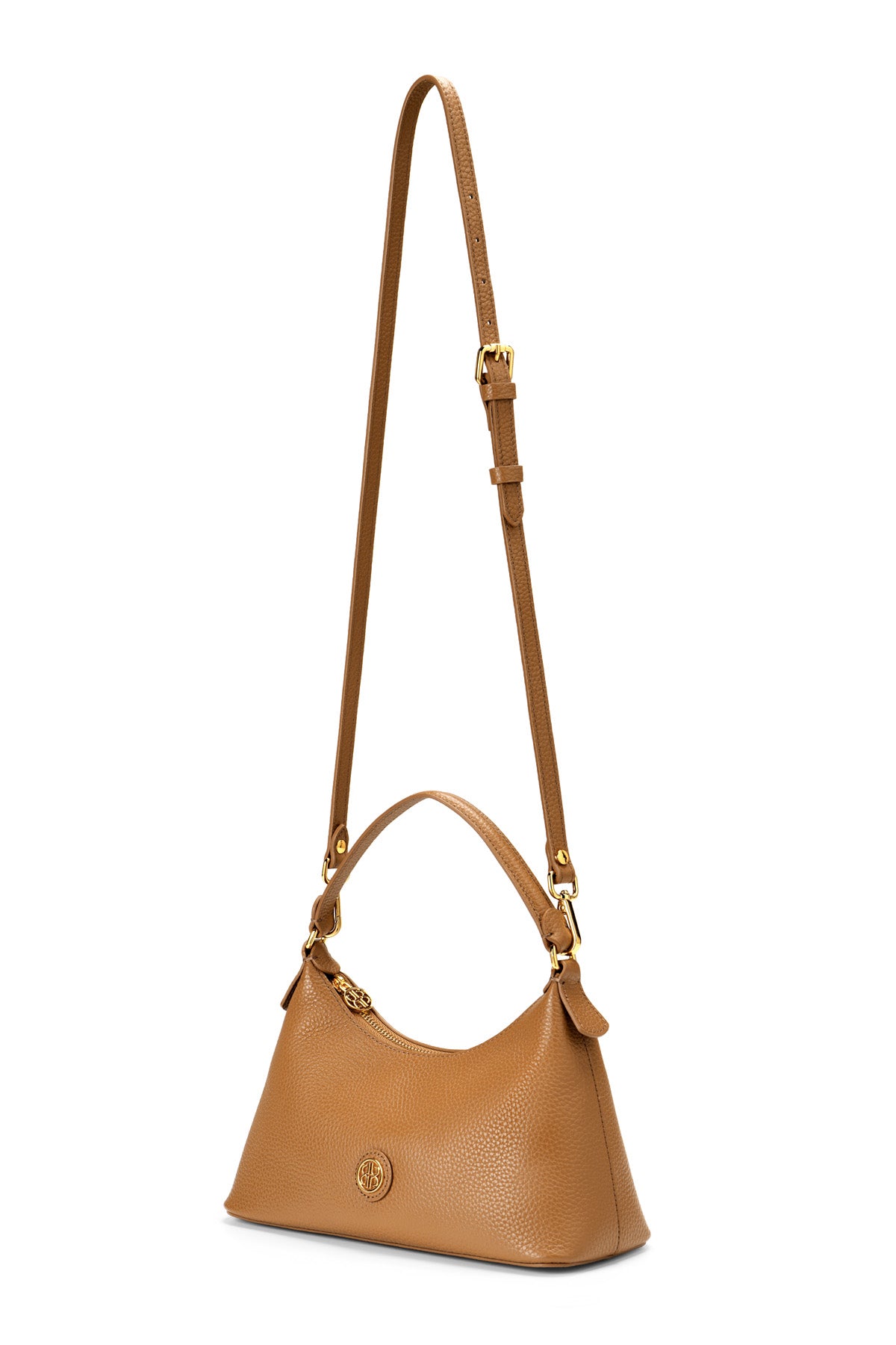 A structured hobo bag made from genuine cow leather, finished with sturdy gold-tone hardware and a signature metal plaque. Designed with a top handle and an additional long adjustable strap for versatile styling.