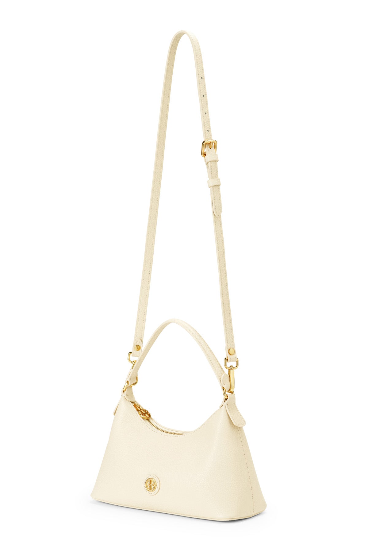 A structured hobo bag made from genuine cow leather, finished with sturdy gold-tone hardware and a signature metal plaque. Designed with a top handle and an additional long adjustable strap for versatile styling.