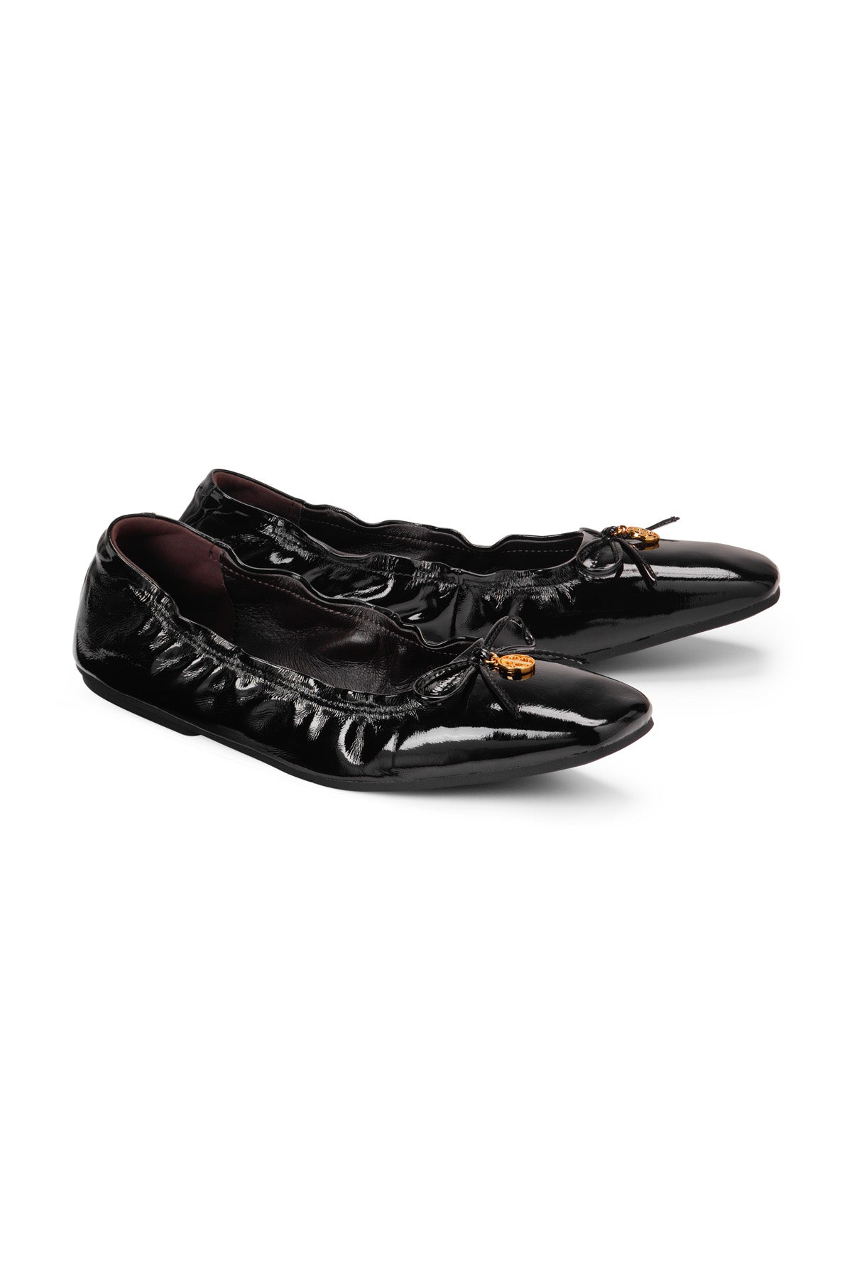 Your elevated everyday flat, crafted in high-shine oil patent leather and lined with 100% sheepskin for comfort that feels as good as it looks. A cushioned heel and flexible anti-slip rubber outsole make them easy to wear all day, while the bow and gold-tone monogram add a feminine finish.