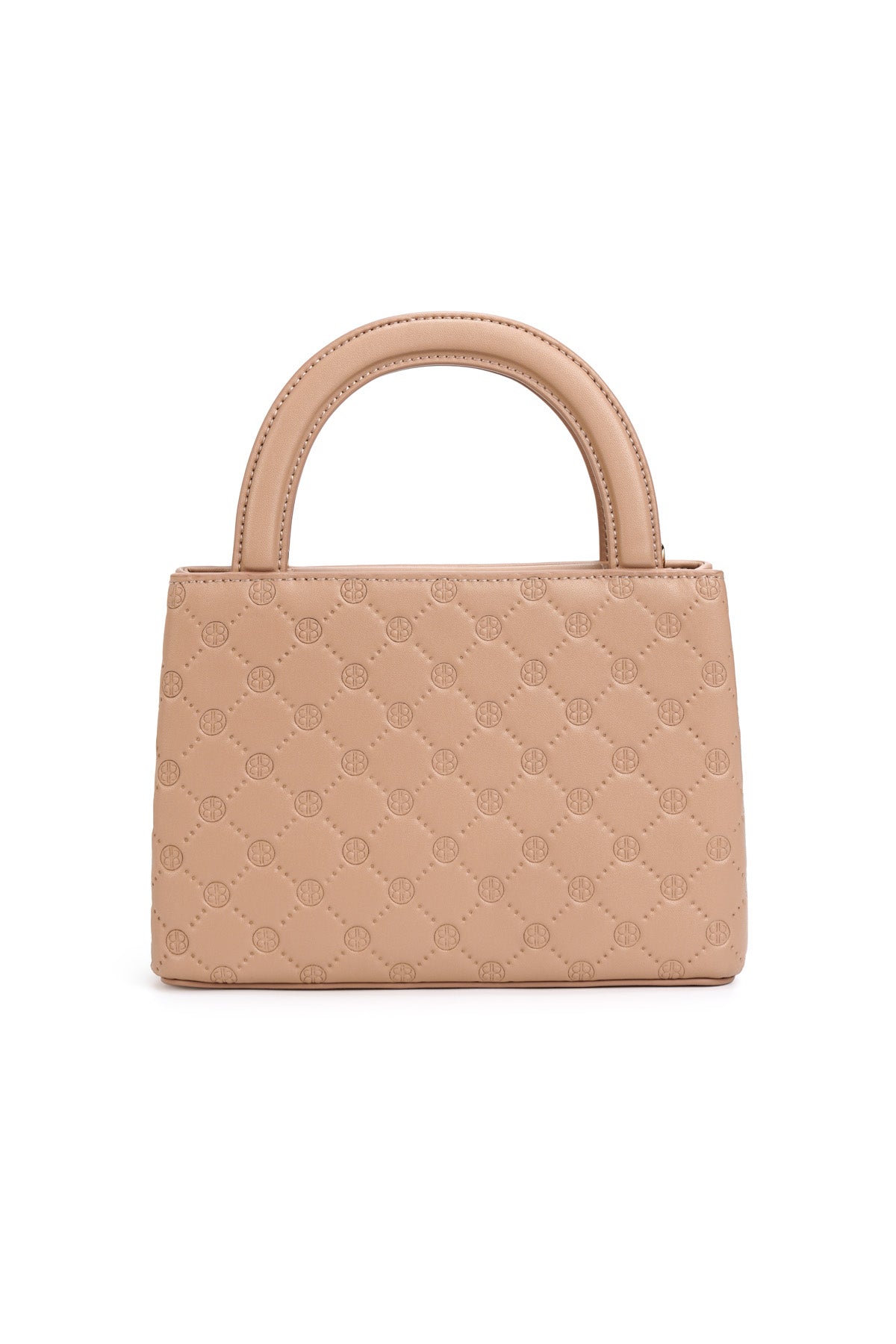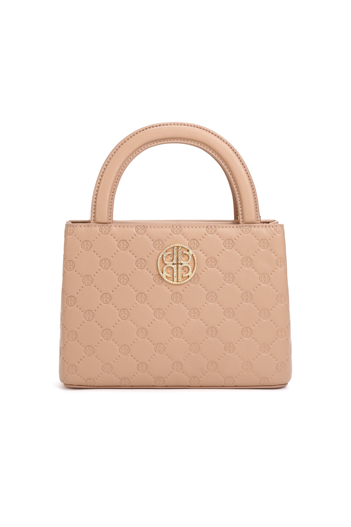 A top handle bag with a structured design featuring an all-over embossed monogram pattern and faux crystal–adorned gold-tone hardware at the center for an iconic look. Finished with a detachable chain strap, this piece is perfect for carrying daily essentials and elevating any look from day to evening.