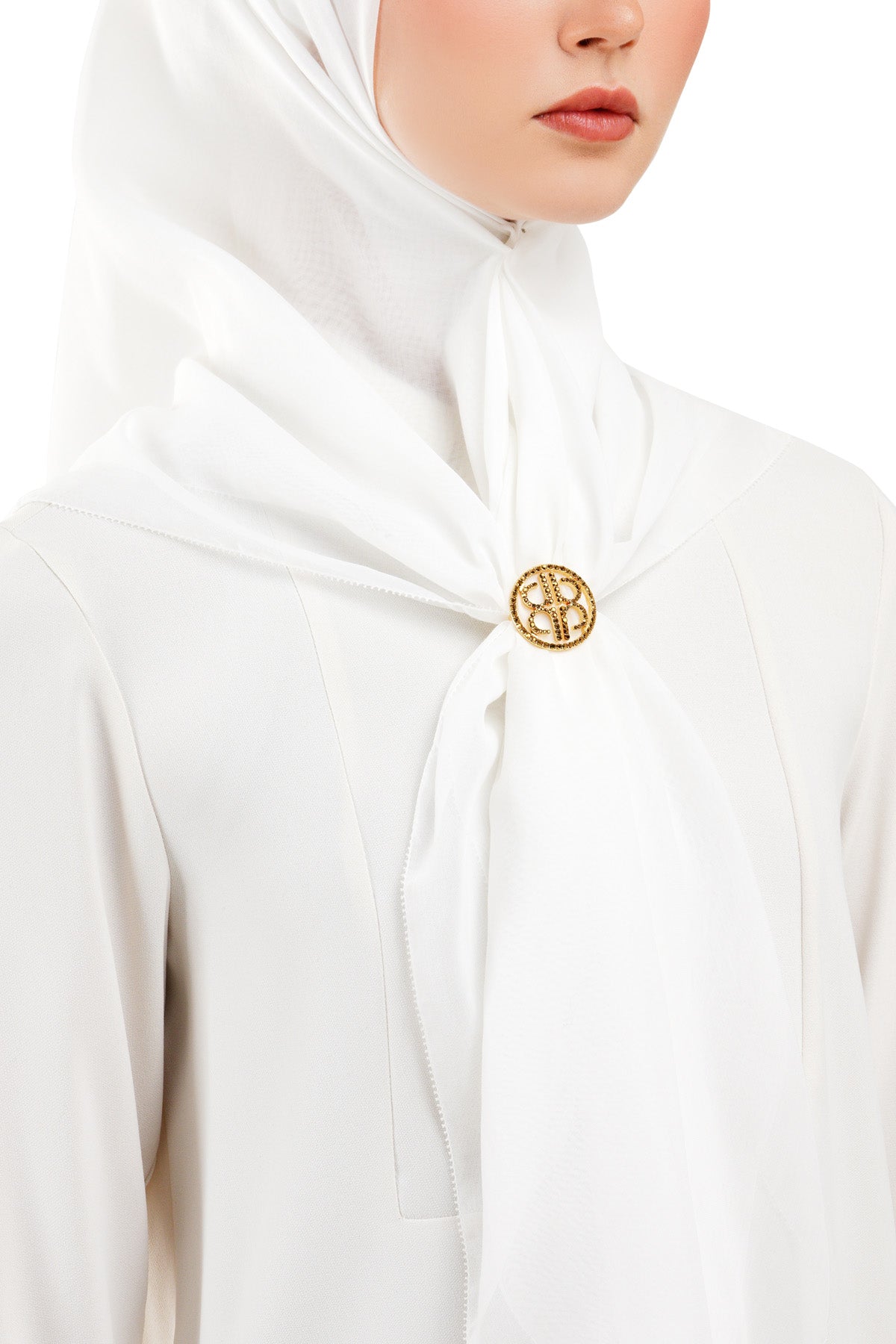 A faux crystal-embellished ring brooch featuring the Nada Puspita signature monogram. Keeps your scarf neatly in place while elevating your outfit with a statement finish. Available in four stunning colors.