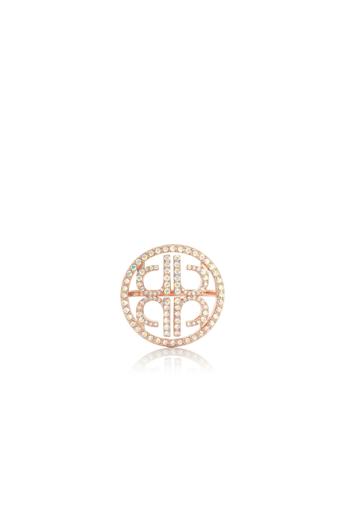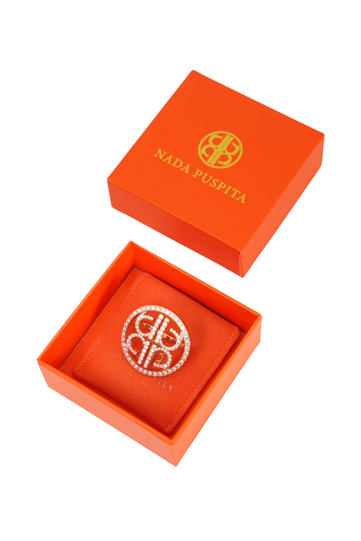 A faux crystal-embellished ring brooch featuring the Nada Puspita signature monogram. Keeps your scarf neatly in place while elevating your outfit with a statement finish. Available in four stunning colors.