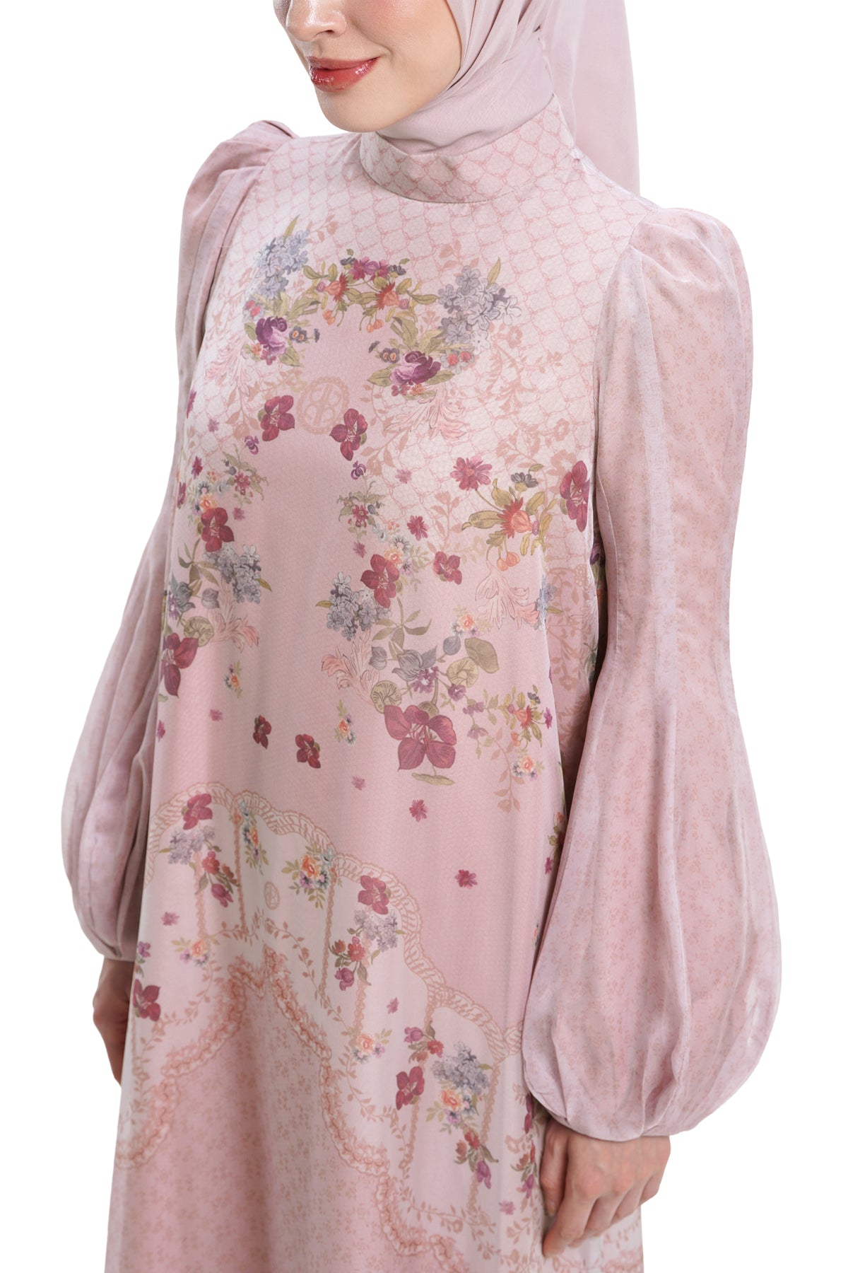 As seen on Dubai Fashion Week SS26, this dress showcases the signature Lace Poem pattern inspired by the delicateness of lace. It comes in a relaxed silhouette with puff sleeves, a high-neck collar, and a concealed back zipper. A layered construction comes as a finishing element that elevates the design.