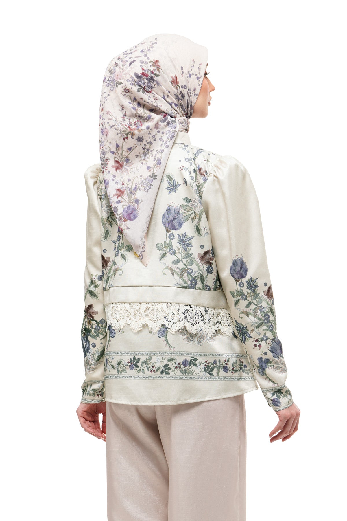 A romantic festive staple featuring artistic florals balanced by crisp tailoring. The mandarin collar and hidden placket keep it sleek, while the puff sleeves and lace waist detail add a soft, statement finish for celebratory occasions.