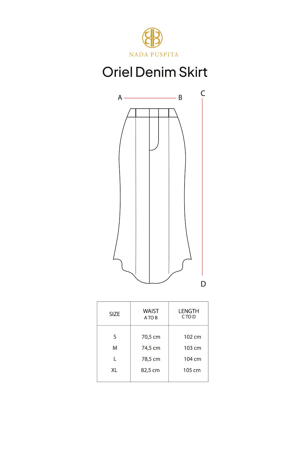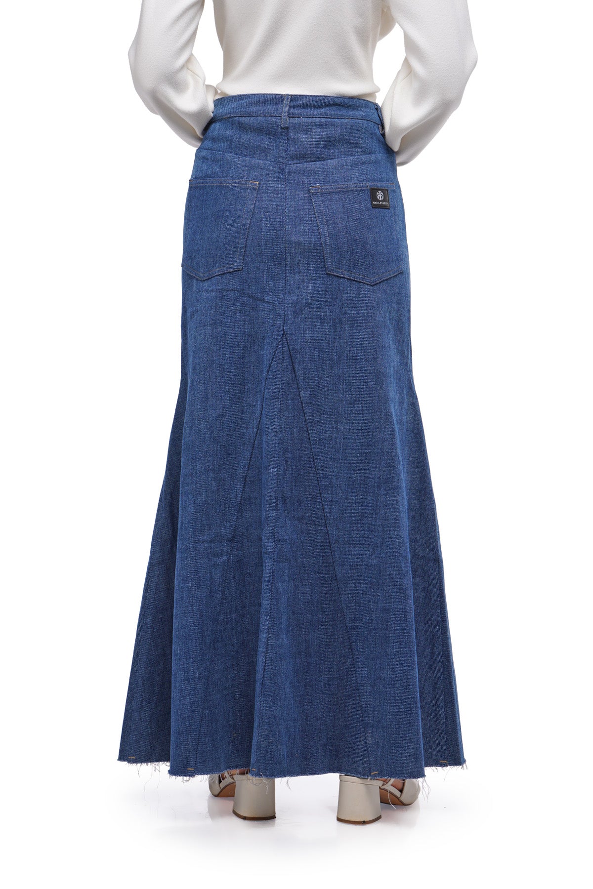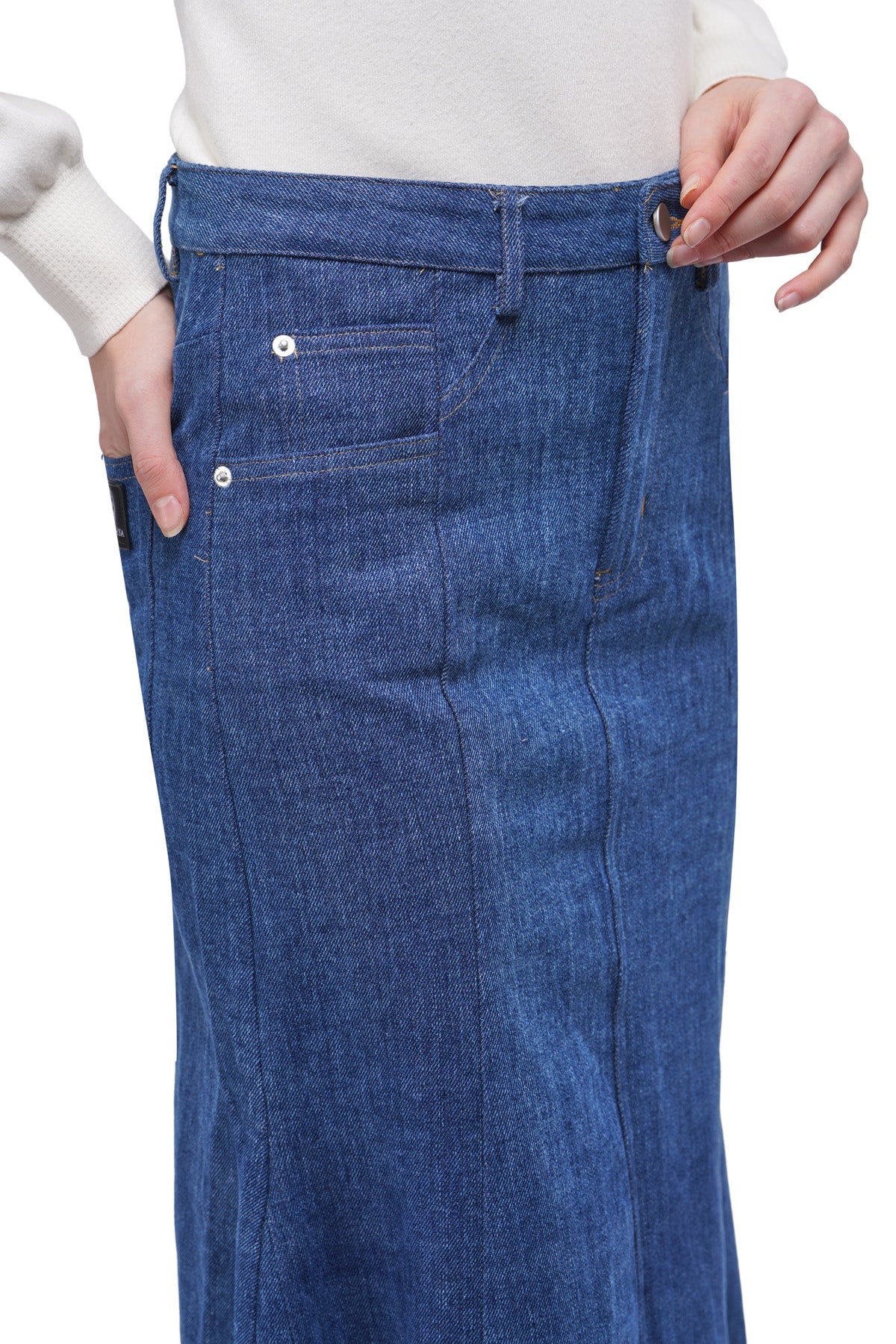 A high-waist denim maxi skirt with a clean, structured shape and an easy A-line finish. Designed with front seam detailing, a defined waistband, functional pockets, and a classic front zip-and-button closure for everyday wear.