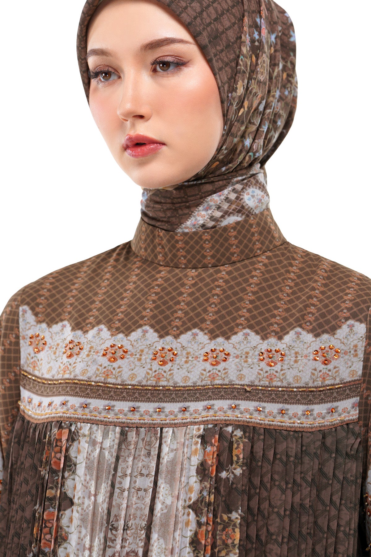 Inspired by the beauty of the Garden of Paradise in Medina, this dress is designed in a flowy silhouette with a high collar and slightly puffed sleeves that add enough volume to balance the fit. Finished with pleats and beaded accents as the main highlight, giving the look an elevated flair.