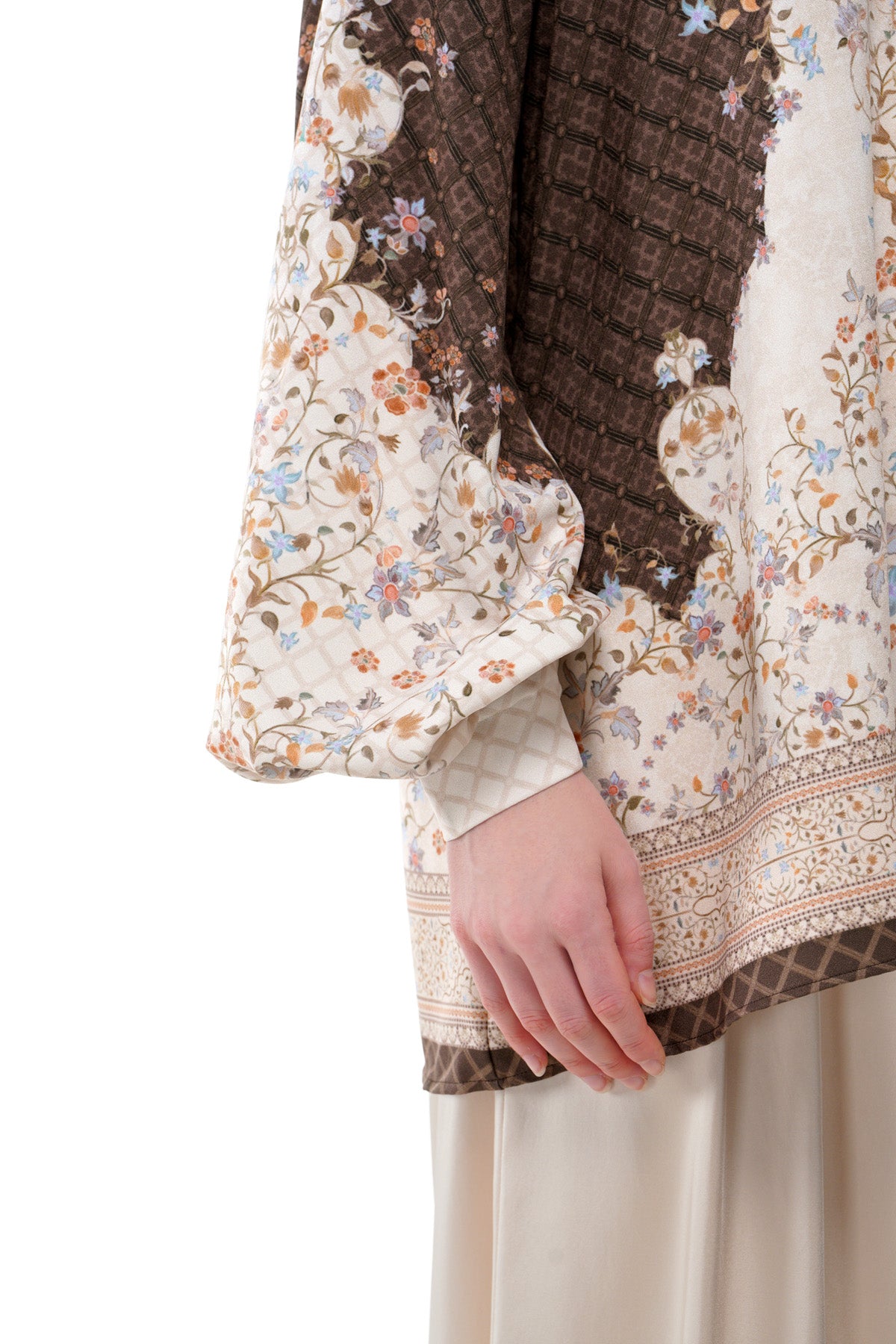 An elegant shirt inspired by the beauty of the Garden of Paradise in Medina. Finished with a standard collar and concealed buttons for a sleek front detail. Puff sleeves are balanced with structured cuffs for a modern, feminine finish, perfect for celebratory moments.
