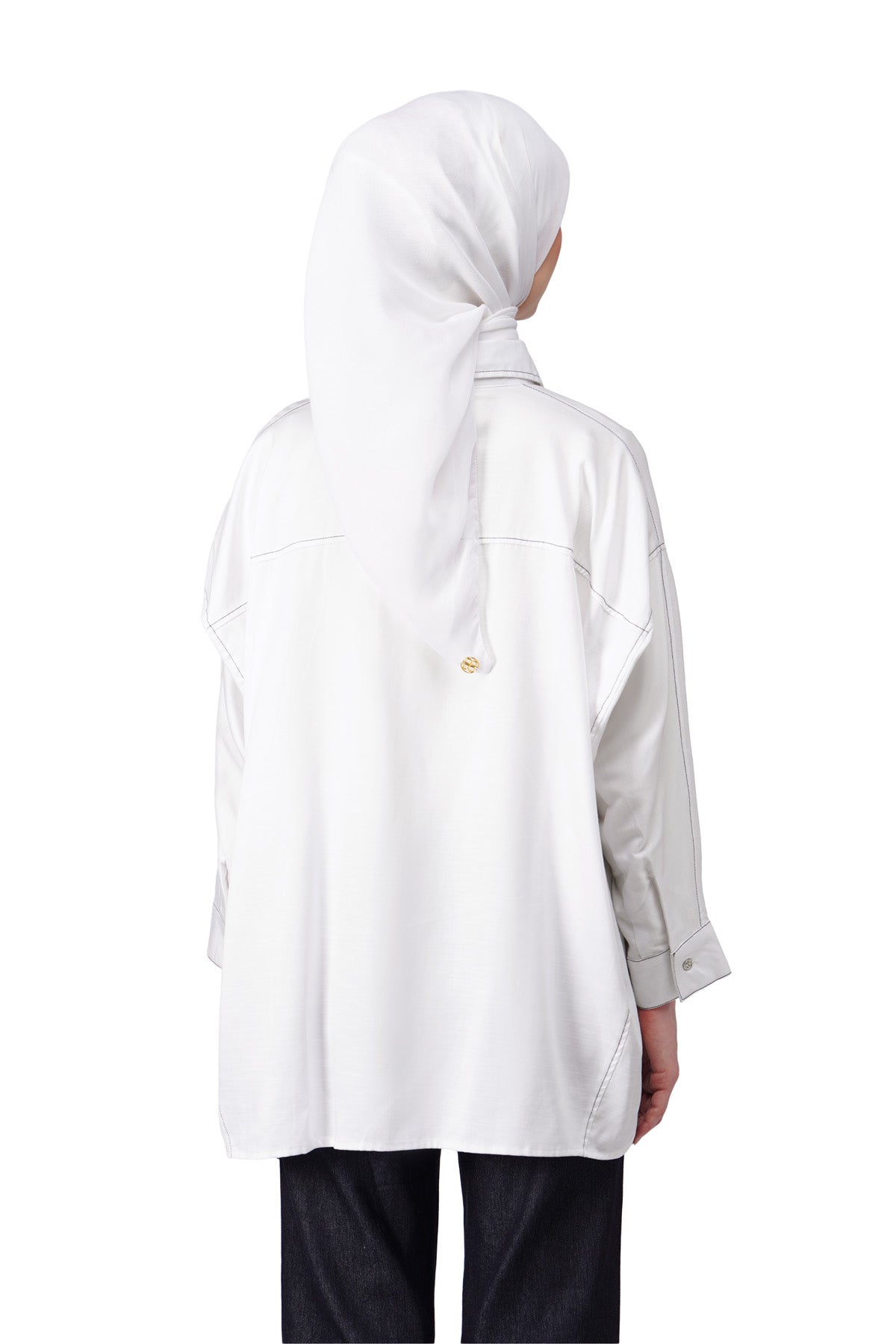 An oversized wardrobe essential with attitude. This oversized shirt features a sleek hidden placket, pointy collar, and contrast white topstitching for a crisp, elevated finish, plus buttoned cuffs to wear loose or neatly styled.