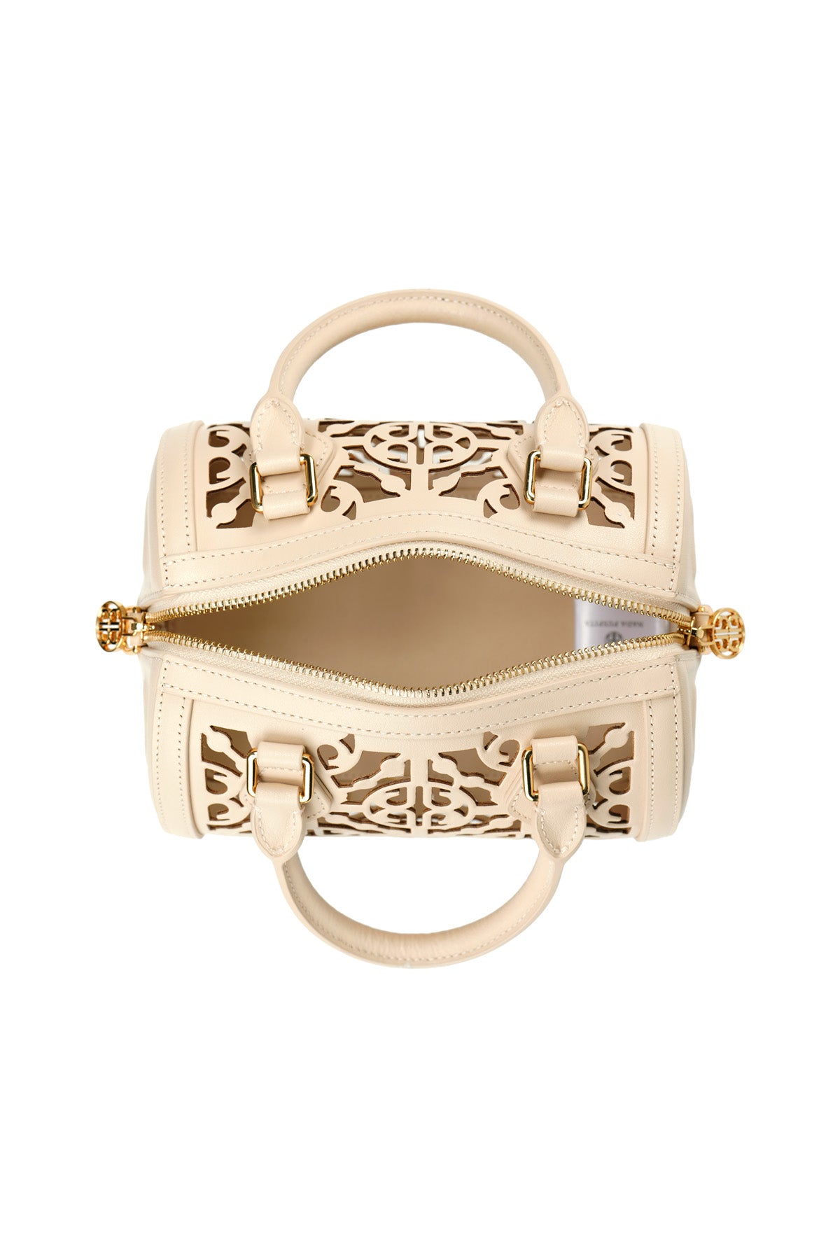 A structured barrel-shaped bag crafted from cow leather. Finished with laser-cut lattice arches forming a monogram pattern, complemented by embossed monogram details on the side panels. Carry it by hand or wear it crossbody with the adjustable strap.